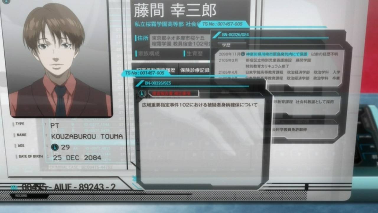 PSYCHOPASS Sinners of the System関東じゃもう18話放送されちゃってるけどねアハハハハハ。 前回ラストで縢が殉職し、「縢ハザード」が大発生。pixivでは泣けるイラストやら小説をたくさん見ましたよえぇ。 槙島逮捕、ヘルメット集団の壊滅で一件落着とはいかず、縢が行方不明になり、2係で 槙島聖護は、藤間幸三郎の脳が入っている局長の殴りつけ、ボロボロにして壊し、脳まで破壊したようです。 こうして、藤間幸三郎としての局長は、死亡しましたが、そのすぐ後の第18話では、 壊された局長の義体が回収されると同時に、すぐに新しい禾生壌宗 局長が、何もなかったかの 藤間幸三郎は免罪体質者であったため、シビュラシステムの威厳と信頼を守るために、 公安局は、未解決事件として捜査本部を解体します。 その後も、狡噛慎也は藤間幸三郎についての調査を個人で進めていたのですが、実は、 藤間幸三郎は、シビュラシステムに統合されていた のでした。